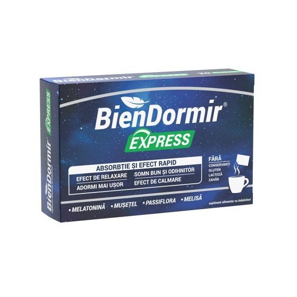 Conceput sub forma de pulbere pentru solutie orala care se absoarbe usor si cu un continut maxim de melatonina alaturi de extracte vegetale standardizate, Bien Dormir EXPRESS vine in ajutorul persoanelor cu dificultati de adormire, asigurand instalarea mai rapida a somnului.