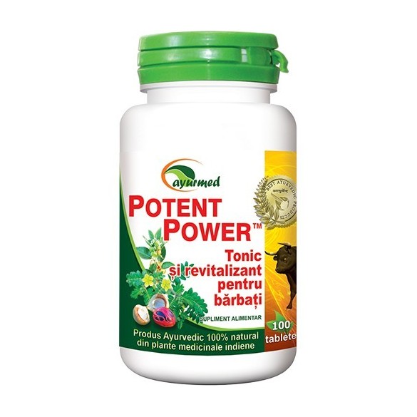 Suplimentul alimentar POTENT POWER este un produs natural din plante medicinale ayurvedice, cu un continut bogat de fitonutrienti cunoscuti pentru proprietatile lor privind mentinerea sanatatii si functiilor sexuale normale. Este sustinut metabolismul, circulatia sanguina, forta si masa musculara, echilibrul hormonal si sexual. Combinatia de plante din POTENT POWER, este recunoscuta pentru efectele sale de sustinere a sanatatii prostatei, sistemului urinar, libidoului, fertilitatii si performantelor sexuale masculine in conditii de stres si suprasolicitare intelectuala si fizica. Este un adaptogen care sustine structurile nervoase, sistemul imunitar, sistemul antioxidant endogen, crescand rezistenta organismului la conditiile de mediu si incetineste imbatranirea.
