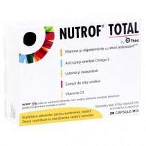 Nutrof Total, produs de laboratoarele Thea din Franta, este un supliment alimentar cu efecte benefice in cazul unor afectiuni oculare, cum ar fi ateroscleroza maculara, cataracta, oboseala datorita expunerii indelungate la lumina artificiala si radiatii (televizor, calculator), dar si in cazul tulburarilor de vedere cauzate de lucrul intr-un mediu toxic. In plus, este recomandat si in cazul starilor care necesita cresterea capacitatii de aparare a organismului (infectii, tumori, varsta inaintata). Nutrof Total completeaza deficitul de vitamine antioxidante si micronutrienti, luteina, zeaxantina si acizi grasi esentiali omega-3, care se poate manifesta din cauza inaintarii in varsta sau a dietei sarace in fructe, legume si peste. Se administreaza cate o capsula o data pe zi, de preferat in timpul unei mese, cu o cantitate mica de apa.