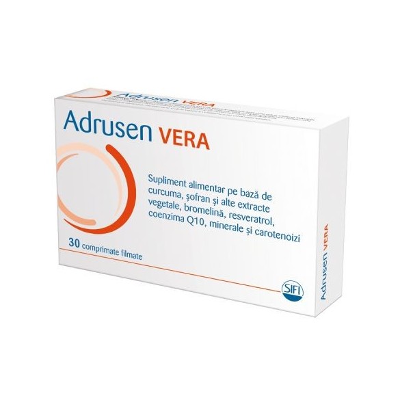 Adrusen Vera este un supliment alimentar pe bază de extracte vegetale (curcuma, salcie, Oxifend, boswellia, piper negru, șofran, bromelină, resveratrol, coenzima Q10, minerale (zinc și cupru) și carotenoizi (astaxantină, luteină și zeaxantină).