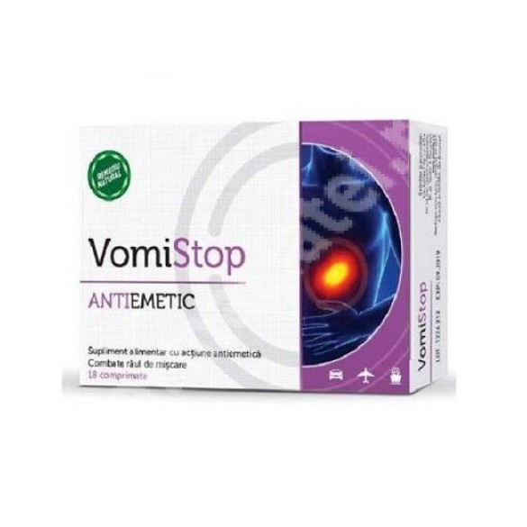 Răul de mișcare din timpul călătoriilor, stările de greață din timpul perioadei de sarcină, dar și dispensiile abdominale apărute după mesele copioase, sunt probleme de sănătate care afectează calitatea vieții fiecăruia dintre noi. VomiSTOP comprimate, supliment alimentar ce conține Vitamina B6, Zinc și extract din rădăcină de Ghimbir. VomiSTOP are efect benefic asupra manifestărilor neplăcute cauzate de răul de mișcare.