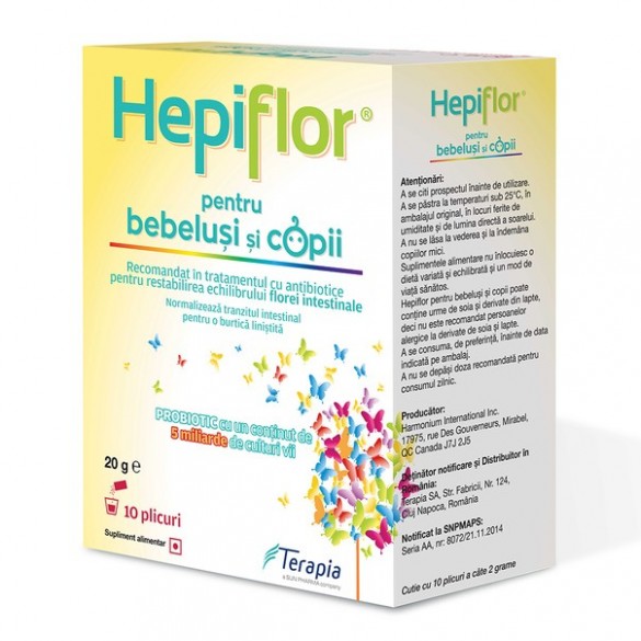 Hepiflor pentru bebeluși și copii este un produs probiotic destinat în special copiilor, dar este recomandat și adulților care preferă administrarea de plicuri ce se dizolvă în apă sau lapte.