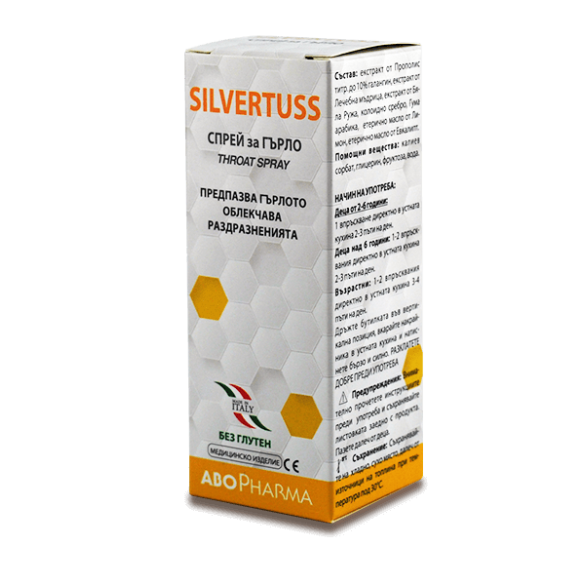 SILVERTUSS – Spray pentru Gât este un dispozitiv medical conceput pentru a calma iritația gâtului asociată cu durere, senzație de arsură și dificultate la înghițire. Prezența extractului de muștar sălbatic (Sisymbrium officinale L.) ajută la vindecarea și restabilirea vocii. Extractul de Nalba mare (Althaea officinalis) bogat în mucilagii, protejează iritația mucoasei orale de agenții externi. Polizaharidele din Nalba mare (Althaea officinalis) ajută la atenuarea iritațiilor căilor respiratorii și au un efect calmant asupra membranelor inflamate ale gurii și gâtului, protejează mucoasa bucala de iritatii și agenți externi. Proprietățile sale antibacteriene previn inflamația.