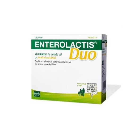 ENTEROLACTIS Duo, un simbiotic, ce conține 8 miliarde de fermenți lactici vii 100% umani și 4 g de inulină, recomandat pentru reechilibrarea florei intestinale.