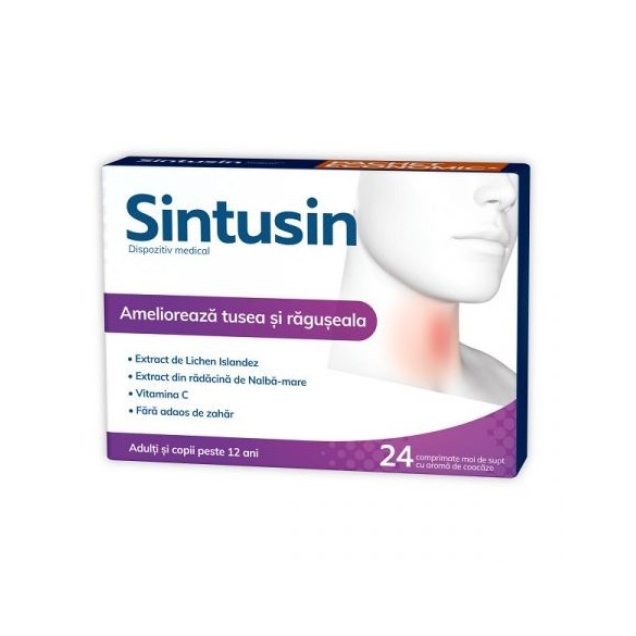 Sintusin comprimate cu extract de Lichen Islandez și rădăcină de Nalbă-mare ajută la ameliorarea simptomelor de răgușeală și gât iritat acoperând cu un strat hidratant membranele mucoase ale gâtului și laringelui, creând un film protector.