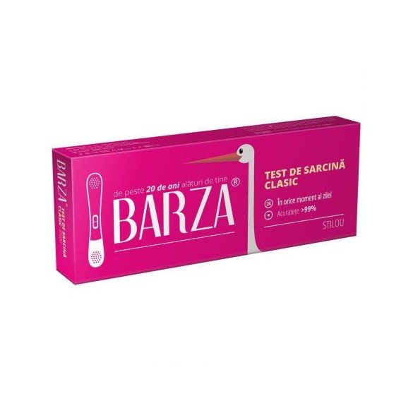 Testul de sarcină Barză Clasic STILOU este un test rapid care depistează prezența hormonului hCG (gonadotropină corionică umană) în urină, încă din prima zi de întârziere a ciclului menstrual.