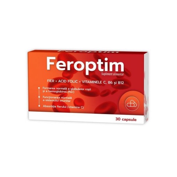 1 capsulă conține: Vitamina C 40 mg (50%*), Fier (bisglicinat de fier) 28 mg (200%*), Vitamina B6 1,4 mg (100%*), Acid folic 400 µg (200%*), Vitamina B12 (100%*)